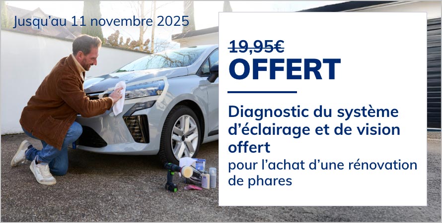Pour tout achat d’une prestation de polissage de phares, bénéficiez gratuitement d’un diagnostic du système d’éclairage et de vision (contrôle visuel des principaux éléments liés à l’éclairage et à la visibilité).